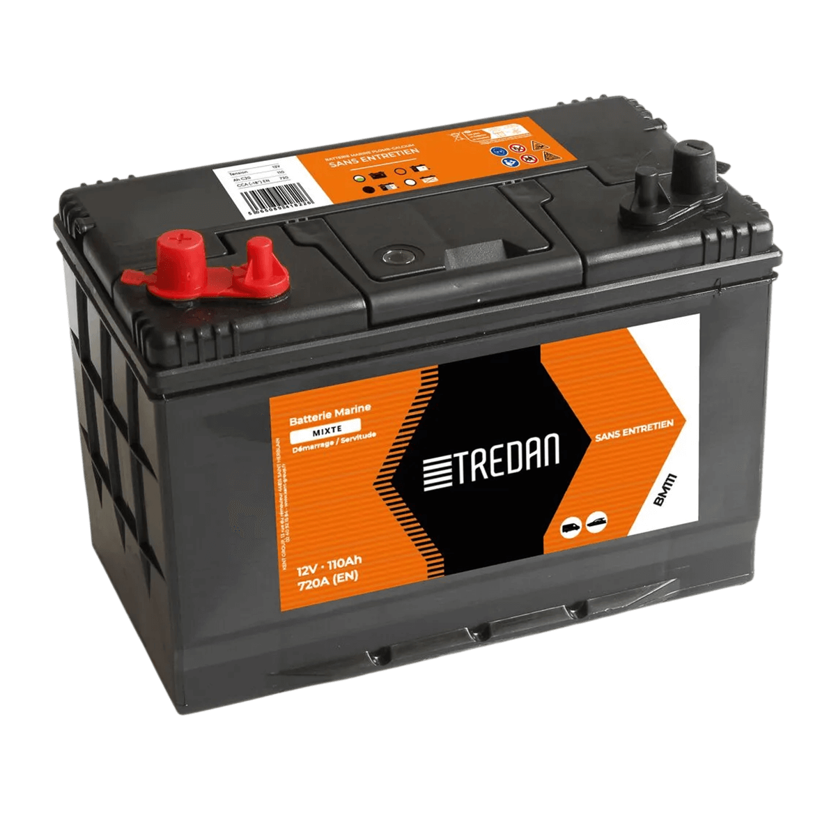 La batterie marine dual TREDAN 12V associe démarrage et servitude pour alimenter le moteur et les équipements de bord. Avec 110 Ah (C20) et 720 A (EN) de puissance de démarrage, elle offre une réserve d'énergie fiable. Technologie plomb à électrolyte liquide, format 302 × 172 × 220 mm pour 20 kg.