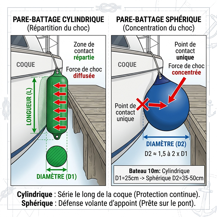 Pour un sphérique, la longueur n’entre pas en jeu : seul le diamètre compte. Et ce diamètre doit être significativement plus important que celui d’un cylindrique pour la même embarcation. La raison est simple : le sphérique n’a qu’un seul point de contact avec la coque et absorbe la totalité du choc en un seul endroit, ce qui concentre les efforts sur une surface bien plus réduite qu’un cylindrique.