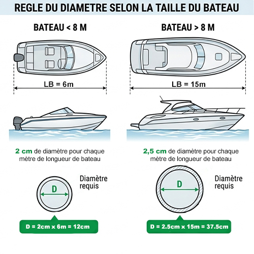 - Bateau de 6 m : 6 x 2 cm = 12 cm de diamètre minimum
