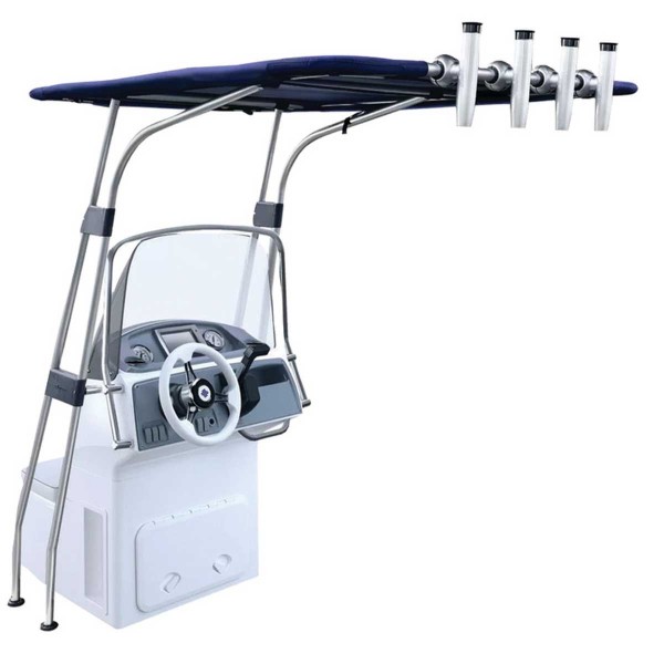 Fabriqué en tube anodisé Ø 32 mm. Universel, car les attaches peuvent être réglés à votre discrétion. Le tissu du "Top" est en polyester ATLAS bleu 400 g/m2 imperméable et résistant aux UV. Tous les composants sont inoxydables.